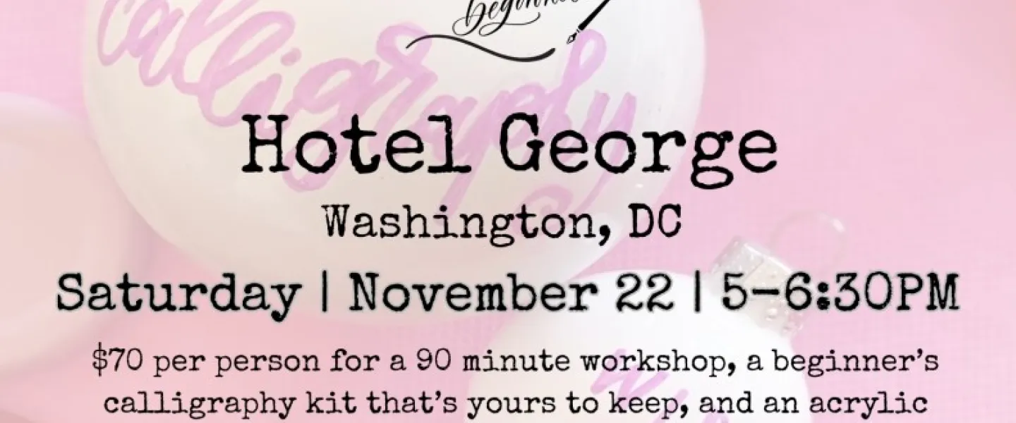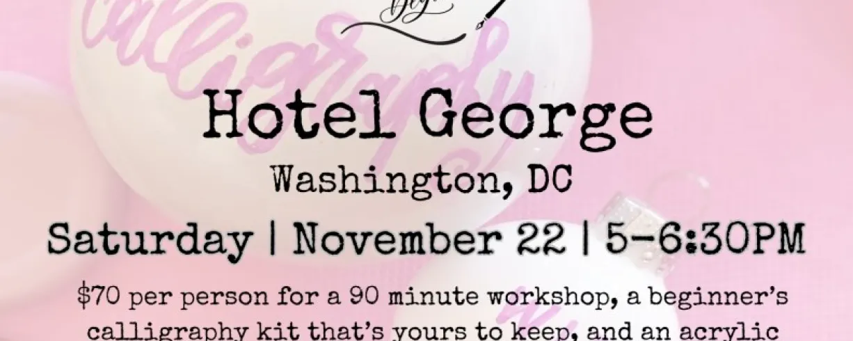 In collaboration with local small business, Sip & Script, join us at Hotel George in Washington, DC, for a festive workshop of holiday fun and pretty lettering for beginners! Whether you’re a stationery nerd, DIY Bride-to-be, or just a crafty individual, in this workshop you’ll be learning an introduction to modern calligraphy with a pointed dip pen and ink. We will cover all the basics and get you ready to add those special lettered details to all your holiday tables, Christmas trees, hostess gifts, gift tags, holiday card mailings and more! Class includes 1.5 hours of instruction and demonstration, our beginner’s calligraphy kit (two nibs, black ink pot, 2 letter guides, tracing paper and straight pen holder), and all materials to write on. Everything is yours to keep at the end of the workshop as well as a complimentary glass of wine! Additionally, we will be lettering on a take-home acrylic ornament at the end of our class time!