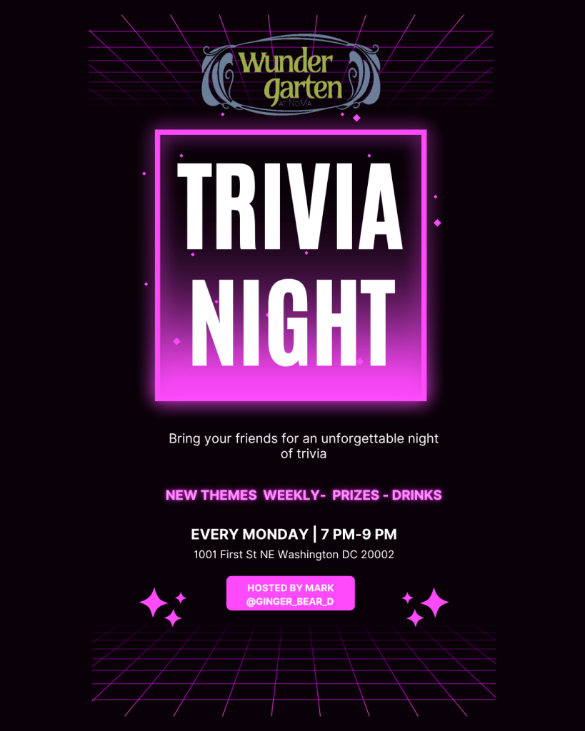 Think you’re a trivia master? Prove it! Join us at Wunder Garten every Monday from 7-9 p.m. for an electrifying Trivia Night! Grab your crew, flex those brain muscles, and go head-to-head in a battle of wits for awesome prizes, bragging rights, and ultimate trivia glory. Whether you're a pop culture pro, history buff, or just in it for the beer and good vibes, there’s a place for you at the table. So rally your squad, sip on some cold drinks, and let’s get quizzical! See you there!