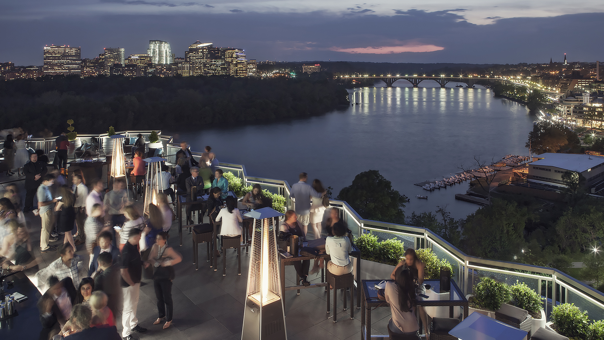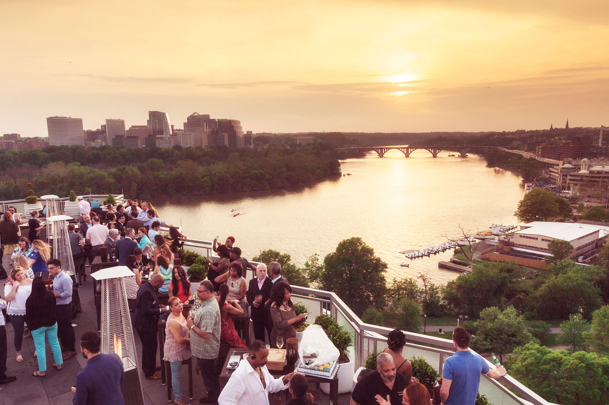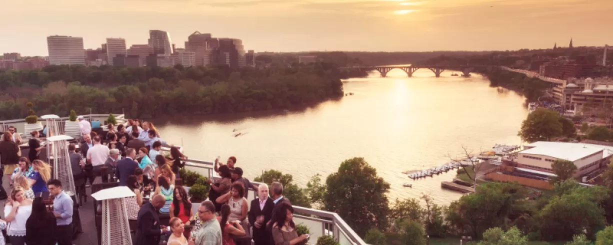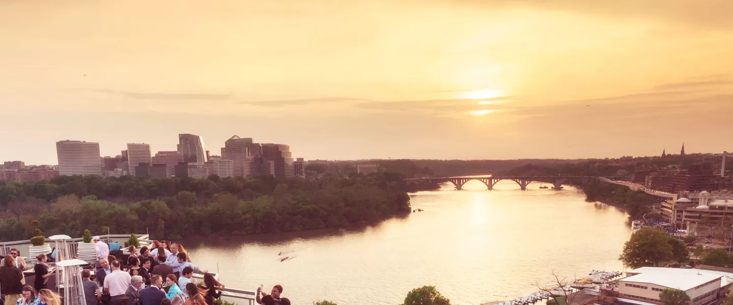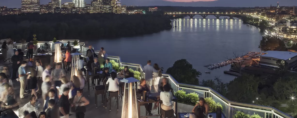 An award-winning open-air rooftop, Top of the Gate offers 360-degree views of the Kennedy Center, Potomac River, the Key and Arlington bridges, Washington Monument and the DC skyline.