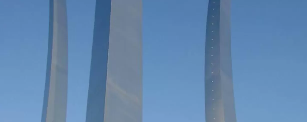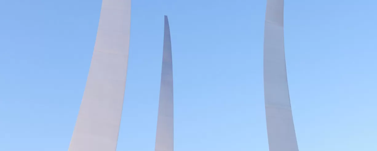 Located in Arlington, VA, the United States Air Force Memorial honors the service and heritage of the men and women of the United States Air Force. The three stainless steel spires reach a height of 402 feet above sea-level. It is adjacent to the Arlington National Cemetery and overlooks the Pentagon.